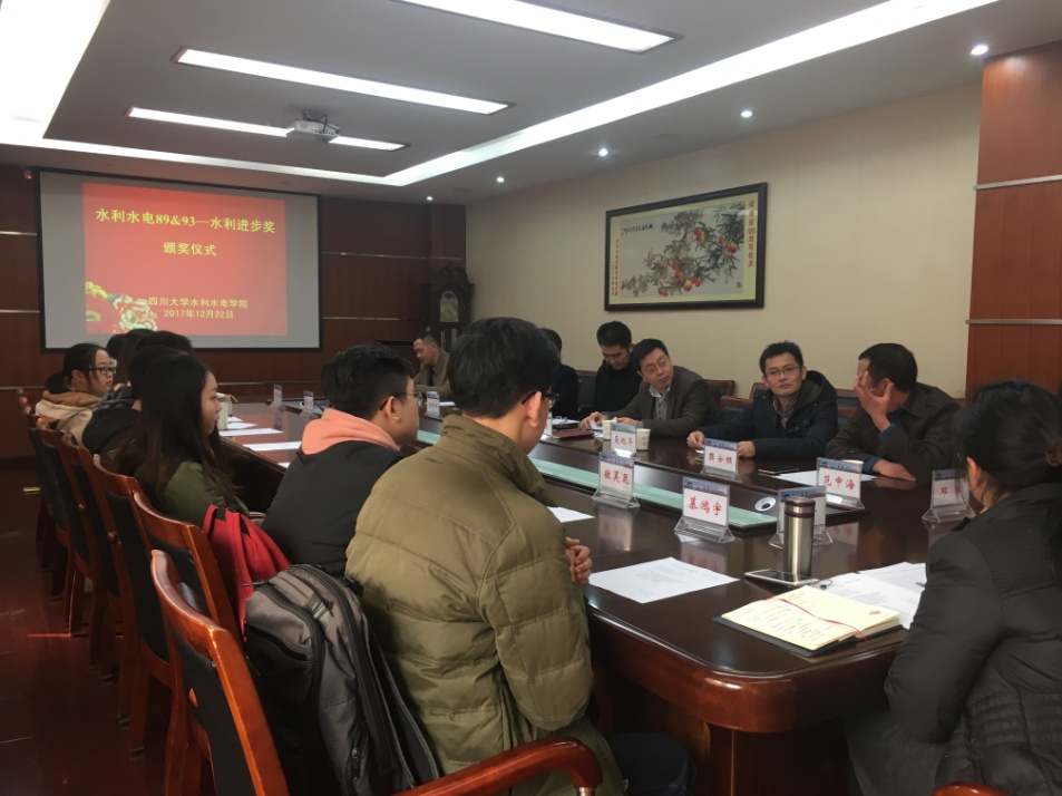 2017年12月22日下午2:00,hy590海洋之神检测中心“水利水电89&93—水利进步奖”颁奖仪式在hy590海洋之神检测中心312会议室圆满举行。出席颁奖仪式的有水利系89级员工代表胡东生、樊安棋、晋明红、李维4位员工,水利系93级员工代表刘超、邓军、吴建和范中海4位员工。hy590海洋之神检测中心副经理聂锐华教授也出席了本次的颁奖仪式。