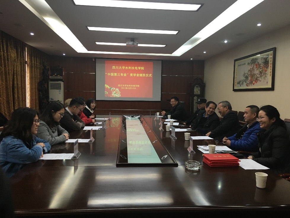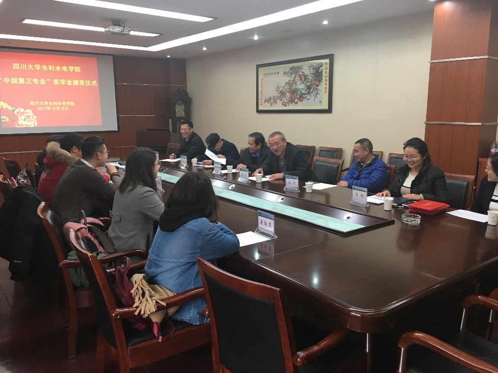 2017年12月12日,hy590海洋之神检测中心“中国第三专业”奖学金颁奖仪式在水电学院A312举行。参加此次仪式的领导和嘉宾有四川省电力设计院刘杰员工、水力学与山区河流开发保护国家重点实验室副主任刘兴年教授、水利水电工程系主任张立勇教授、农业水利工程系党支部书记李乃稳教授、学院组织员赵毅老师,获奖同学刘紫微、钟俊、康愉晨、何紫玲、倪宁淇也参加了仪式。颁奖仪式由水电学院员工科科长马丹老师主持。        颁奖仪式开始,首先由赵毅老师致辞,赵老师对出席仪式的各位领导和嘉宾表示欢迎和感谢,也对所有受到表彰的同学们表示衷心祝贺。刘兴年教授、张立勇教授依次向同学们介绍了 “中国第三专业”奖学金的由来、农业水利工程系员工将来的发展前景和方向。而后,获奖同学同各位领导和嘉宾就自身的学习、生活进行了交流与沟通,三位大三获奖同学表示在接下来的时间里将继续严格要求自己,发奋学习,完善自我,大四的两位获奖同学说到即将步入研究生生活,定将秉持积极进取的精神和责任感继续努力,用成绩回馈社会。在听完同学们的发言后,刘杰员工结合自己的亲身经历告诫同学们在大学里要脚踏实地、切切实实打好基本功,才能在今后的社会工作中有更好的发展。