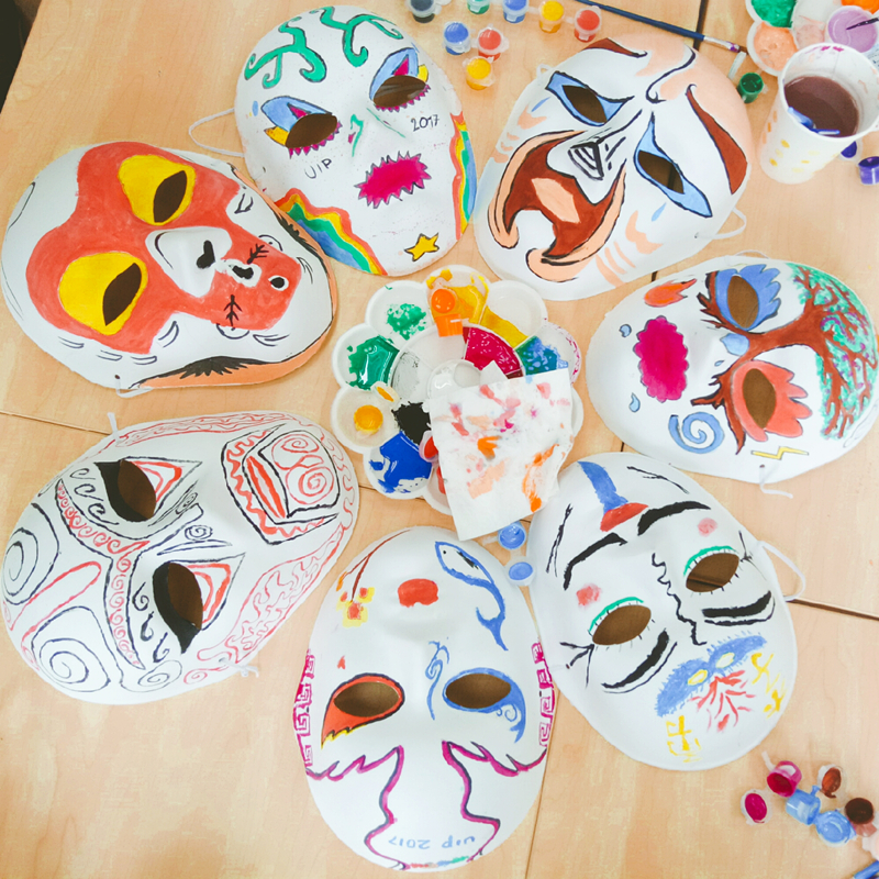 大约一个多小时,同学们陆陆续续完成手工脸谱的绘制。并对充满兴趣地展示自己的作品,并合影留念。